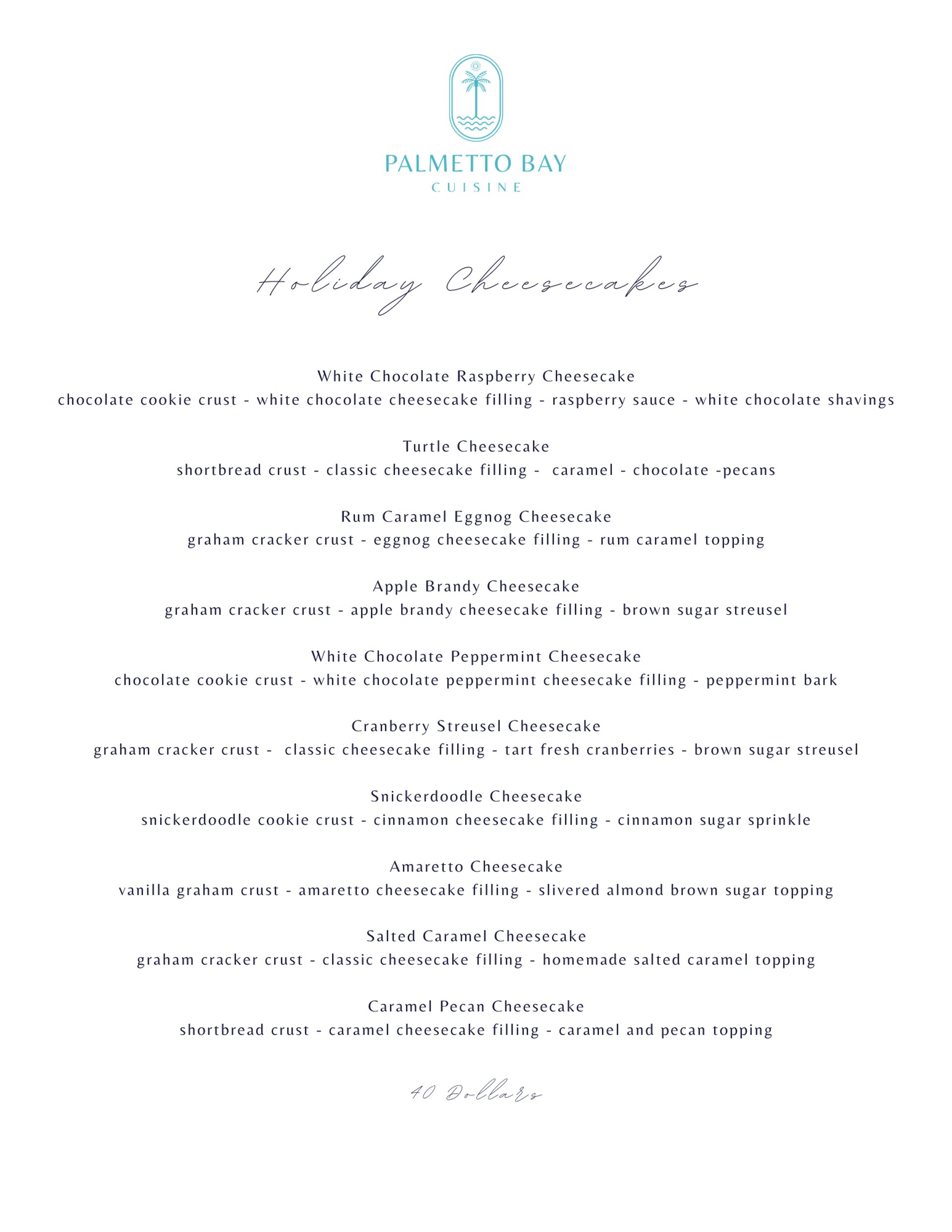 From classic flavors to holiday showstoppers, each slice of our homemake cheesecakes is unforgettable. Perfect for parties, family gatherings, hostess gifts or last-minute gifting, our cheesecakes will impress your friends and family - and keep your kitchen clean!
